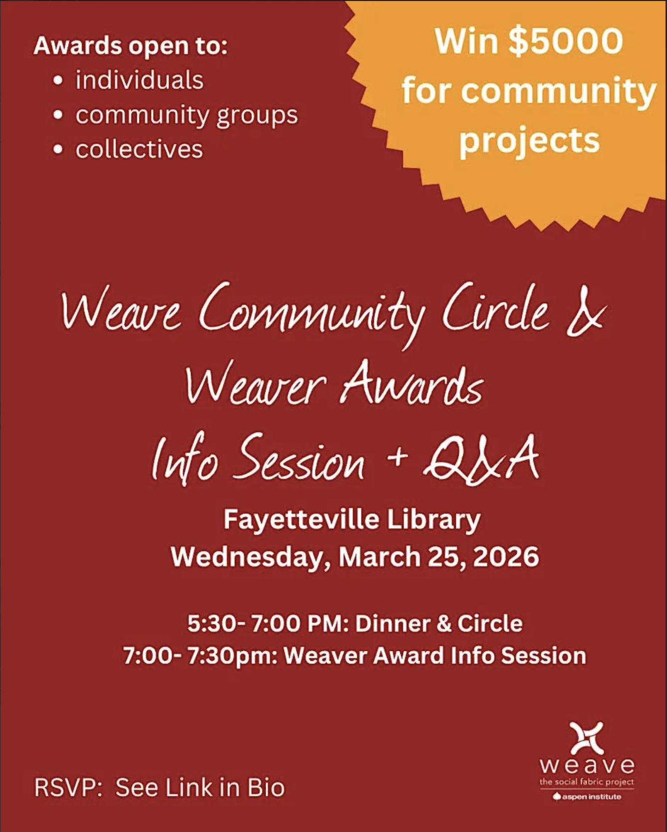 📍Fayetteville Public Library, 401 West Mountain StreetJoin us for a dinner, a community circle on the theme of "finding hope in your community” Stay and learn about the 2026 Weaver Awards!