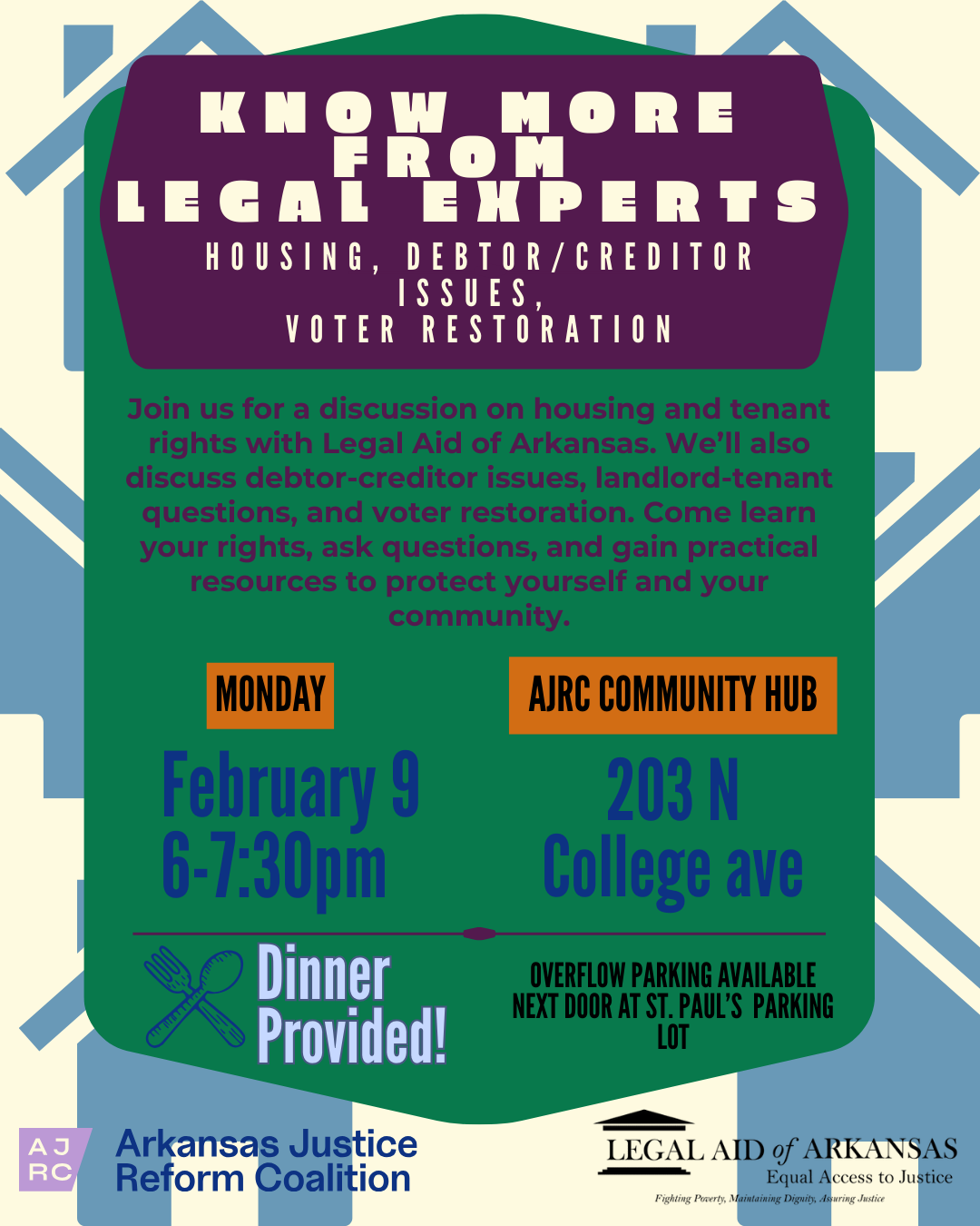 📍AJRC Community Hub, 203 N. College Ave., FayettevilleJoin us for a discussion on housing and tenant rights with Legal Aid of Arkansas. We’ll also discuss debtor-creditor issues, landlord-tenant questions, and voter restoration. Come learn your rights, ask questions, and gain practical resources to protect yourself and your community in these areas.