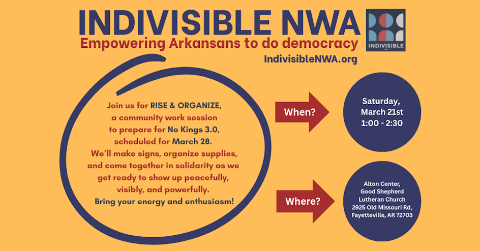 📍Alton Center, Good Shepherd Lutheran Church, 2925 Old Missouri Rd, Fayetteville, AR 72703This peaceful and nonviolent action is hosted by Indivisible NWA.