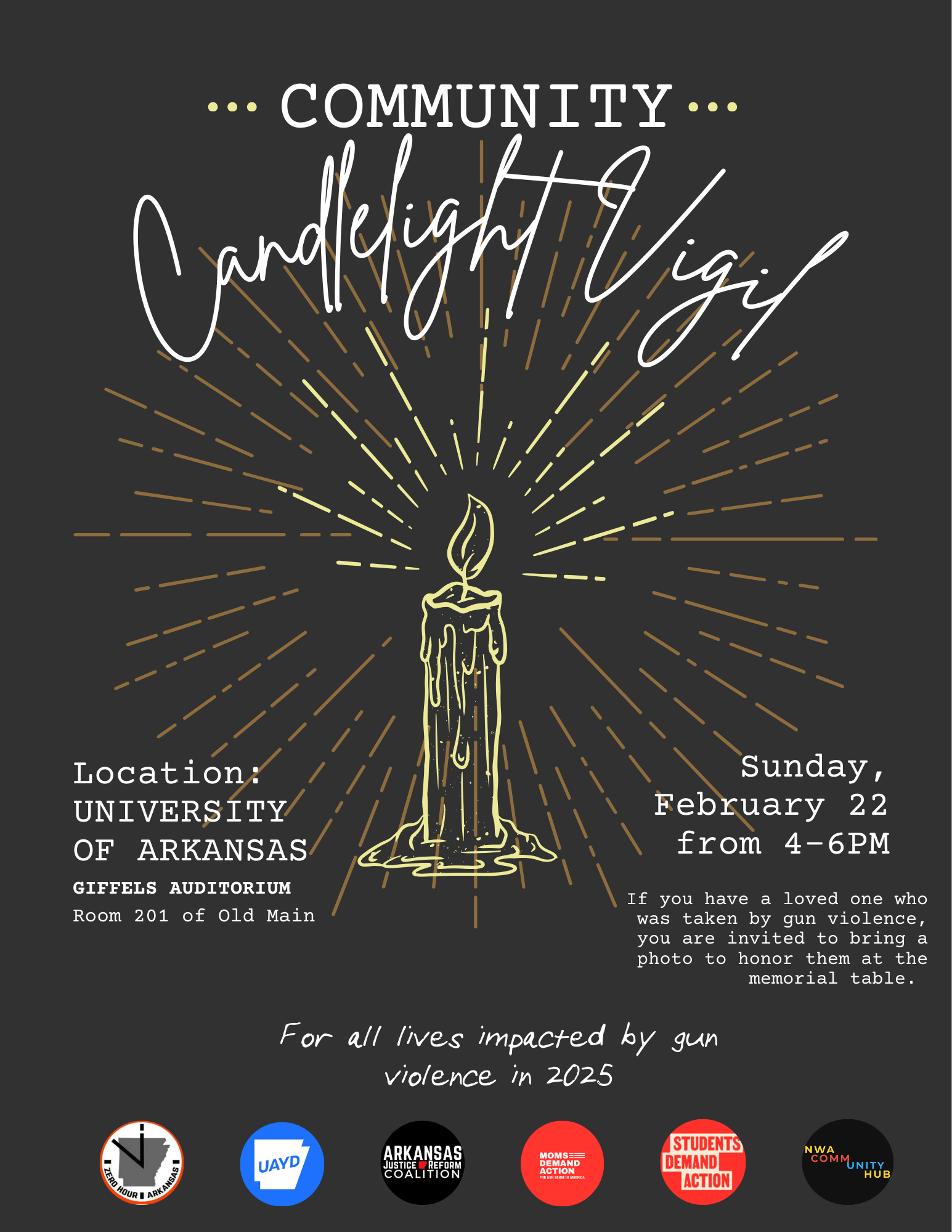 In light of last semester's Aug 25 shooting hoax and lockdown, we believe the University of Arkansas Campus is a meaningful place to host this vigil.