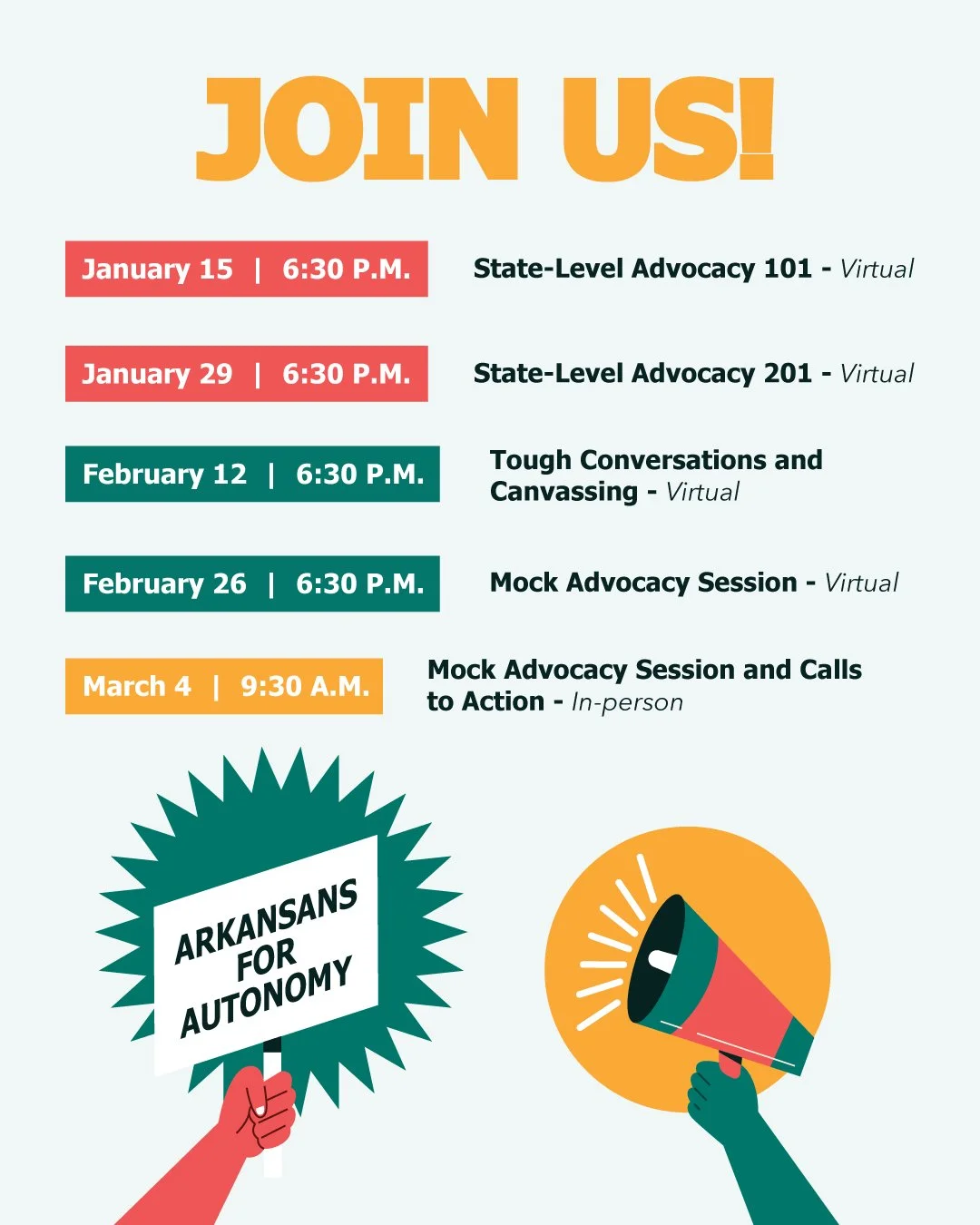 Virtual + In-Person (State Capitol)Build your advocacy skills this winter! The Arkansans for Autonomy Advocacy Training Series is a multi-session, virtual (and in-person) program designed to equip Arkansans with the tools to engage elected officials, mobilize their communities, and take meaningful action for bodily autonomy. From Advocacy 101 to mock advocacy sessions at the Capitol, this series offers practical, hands-on training for anyone ready to get involved.